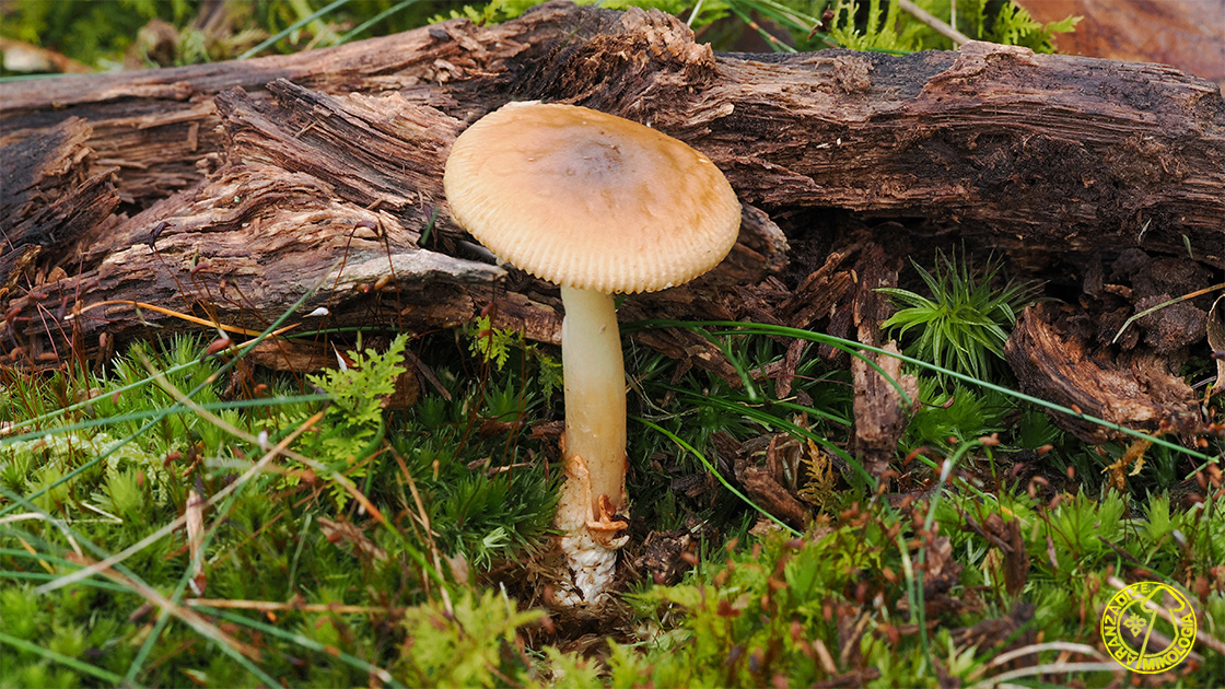 Pie: cilíndrico, frágil, engrosado hacia la base, blanquecino con tonos parduzco-anaranjados, sobre todo hacia la base. Volva amplia, alta, blanca, manchada de color similar al del sombrero.