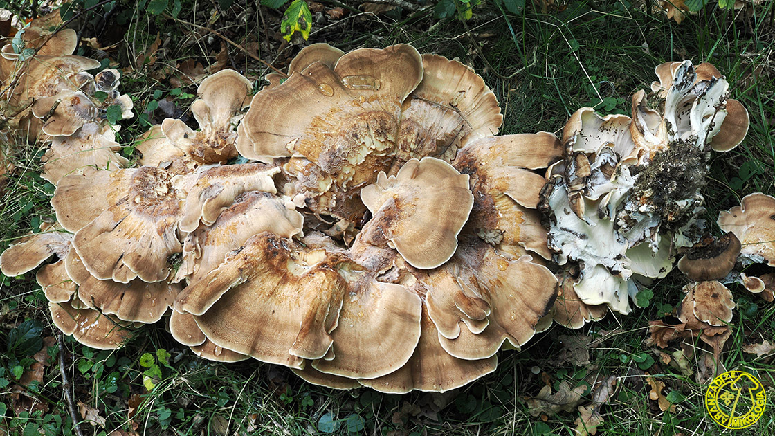 Basidioma: fructificación sésil, de hasta 60 cm de Ø, formada por sombreros superpuestos. Superficie marrón rojiza, más oscura con la edad, zonada, aterciopelada, radialmente rugosa. Margen ondulado, amarillento.