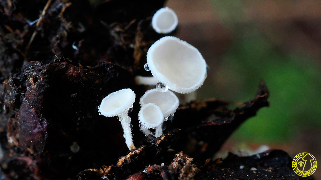 Askoma: globo formako fruitu-gorputza ale gaztetan, eta kopa formakoa umotzean, 0,5-3 mm-ko Ø eta 1-3 mm-ko altuera, hanka txikia duena. Barrualde edo himenoforo laua eta zuri-krema kolorekoa. Kanpoalde eta ertz zuria, ile zuri ugariz estalia, zilindrikoa, erdialdean hanpatua, trenkatua eta punta zorrotzetan amaitua.