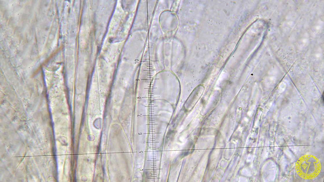 Microscopía: esporas elípticas, lisas, hialinas, sin gútulas, de 12-15 x 8-10 µm.
