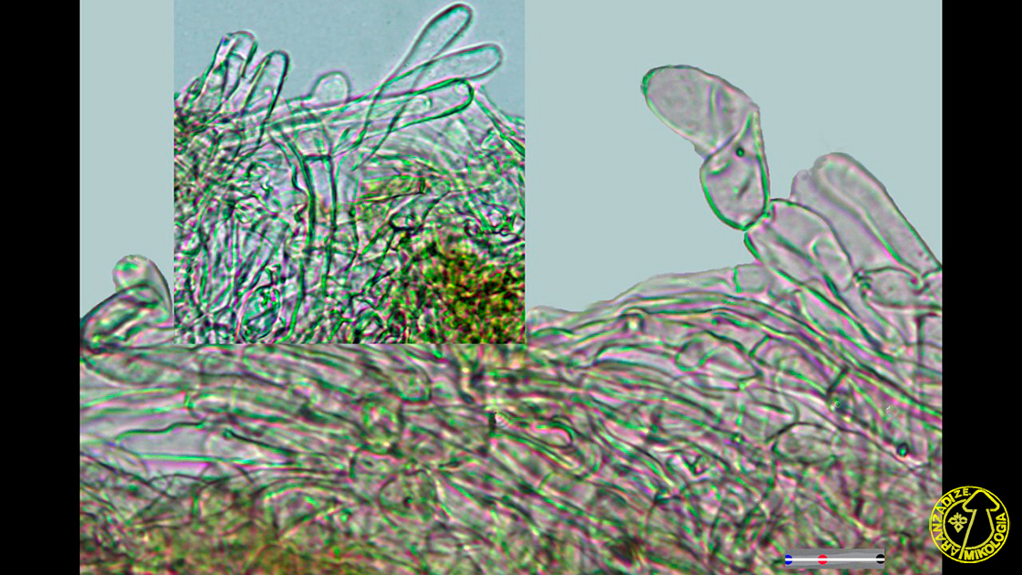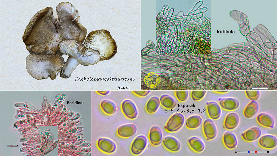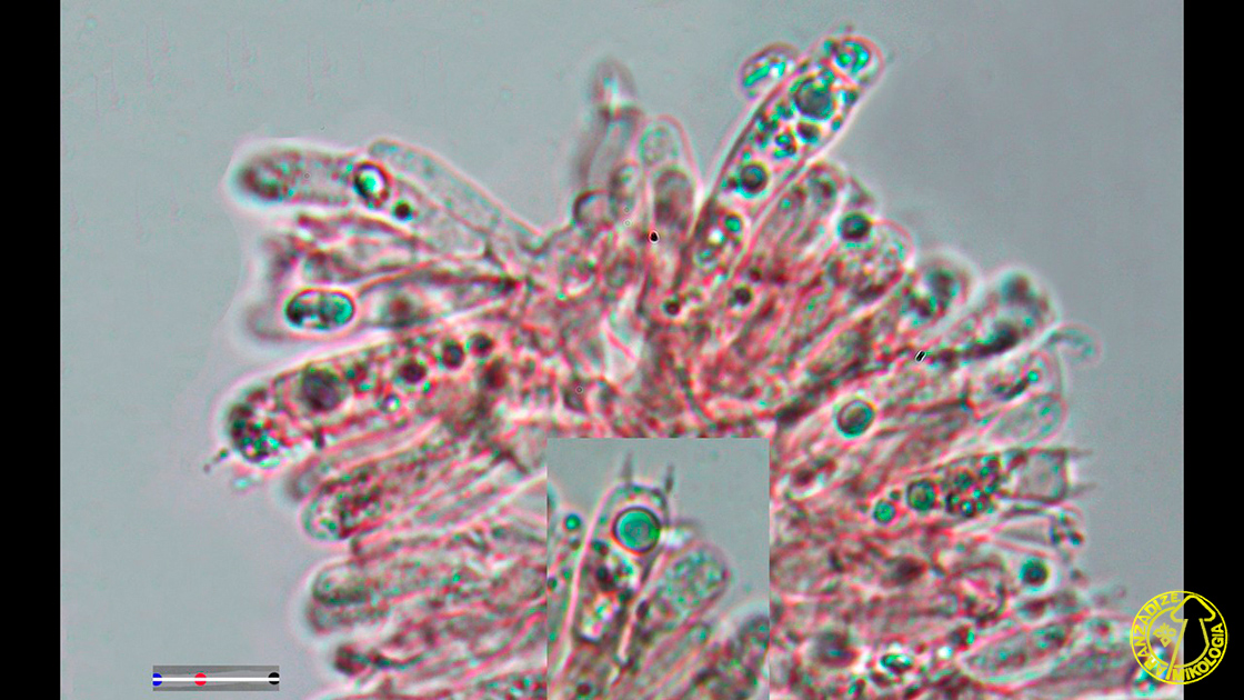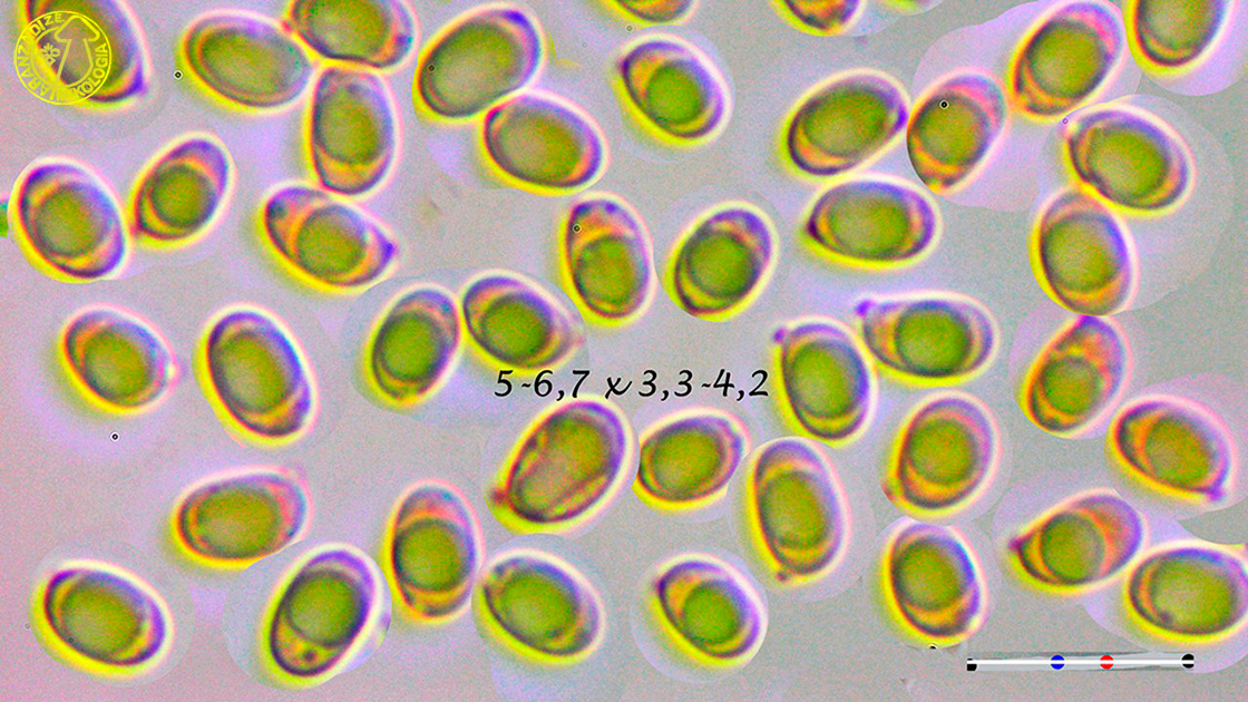 Mikroskopia: esporak piloan zuriak, eliptikoak, leunak, hialinoak, gutuladunak, 5-6,5 x 3-3,5 µm-koak.