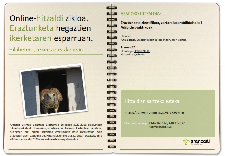 Hitzaldia Ornitologia / Eraztuntze zientifikoa Eraztunketa zientifikoa, zertarako erabili daiteke? 26azaroa 2025Asteazkena Ordua 19:00 Tokia Online Salneurria Doan Izena eman Izena eman