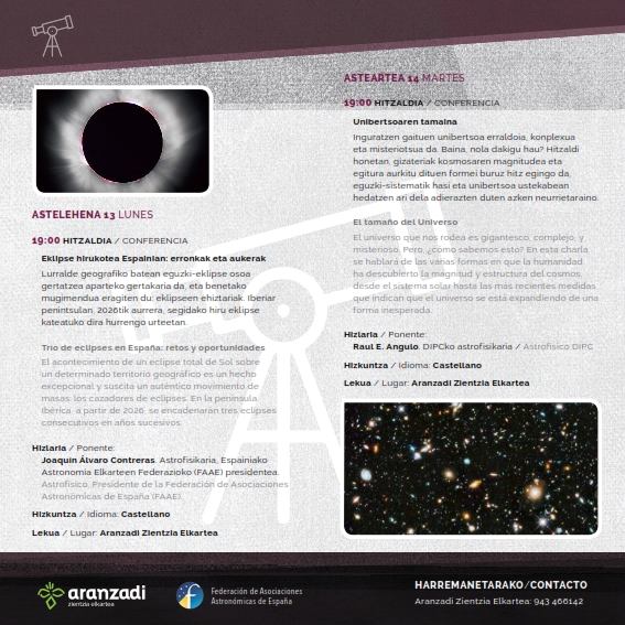 Aurtengo topaketaren gai nagusia Eguzkia izango da, eta partehartzaileak hori hainbat ikuspegitatik behatzen ahaleginduko dira, haren funtzionamendua, eguzki-sisteman duen eragina eta Lurreko bizitzan duen funtsezko zeregina ulertzeko. Hitzaldien eta behaketa baten bidez, izar honi buruz gehiago ezagutuko dugu: bere poloak, eguzki-haizea, eguzki-leherketak, materia-eiekzioak, heliosfera edo eguzkiaren aktibitate-zikloak. Topaketan, halaber, Astronomia Herritarra Talde Irekiak urtean zehar Medialab-en egiten dituen proiektu batzuk ere erakutsiko dira.